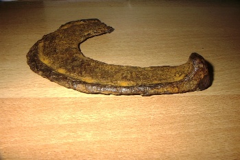 | Diese beiden Hufeisen grub ich im Wald bei Übrigshausen-Brachbach aus. Wie alt sie sind, konnte ich noch nicht feststellen. Vielleicht stammen sie von den sächsischen Truppen vom kaiserlichen General Franz Albrecht von Sachsen-Lauenburg, die hier im Wald ab dem 24. Juni 1626 4 Tage lang lagerten. Oder stammen die Eisen von anderen Truppen die hier durchkamen, Hohenlohische, Bayerische, Französische, Schwedische... (Nicht abgebildet ist der geschmiedete Nagel, ein Granatsplitter aus Eisen und scharfe amerikanische Übungsmunition die ich auch in dem Wald fand.) |